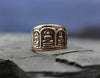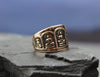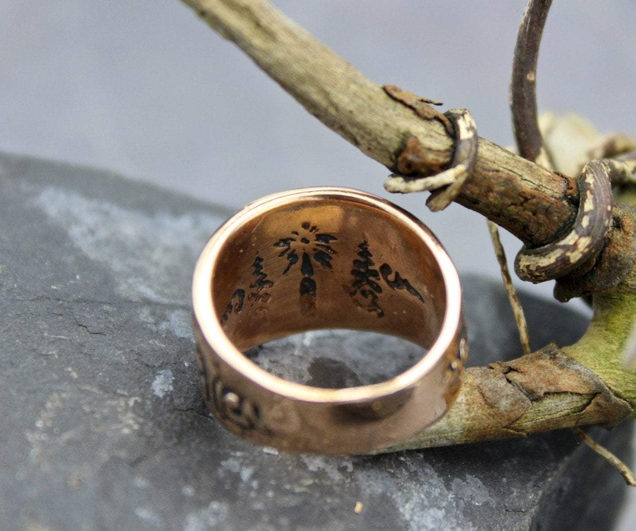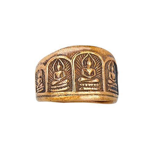 This is one of our new favorite rings. Beautifully styled in polished copper with a repeating pattern of 5 Thai-style seated Buddhas.