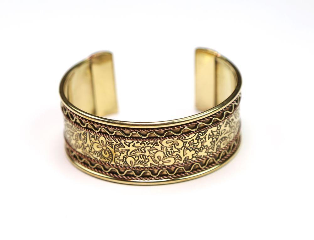 This adjustable cuff bracelet has an intricately carved floral design. The copper and brass sections create a multi-color look. The bracelet was handmade by artisans in India following Fair Trade practices.