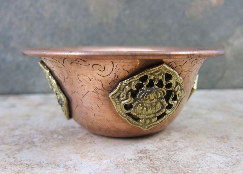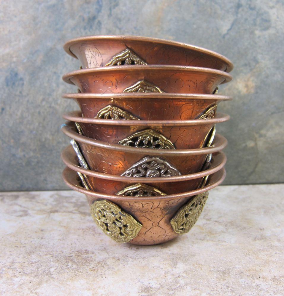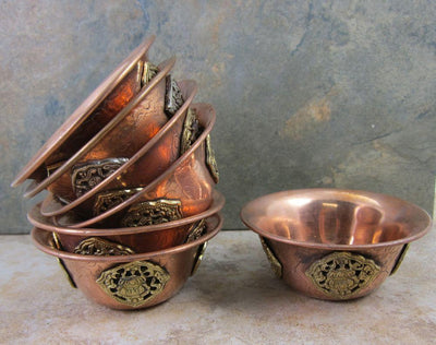 A beautiful set of seven copper offering bowls.  A set of seven offering bowls may be placed on one's shrine and filled with water daily as a way of accumulating virtue and merit.  Handmade in Nepal.