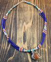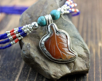 Awesome Tibetan necklace featuring six strands of lapis and coral beads accented with turquoise to a focal carnelian leaf. Also features a variety of silver accent beads.