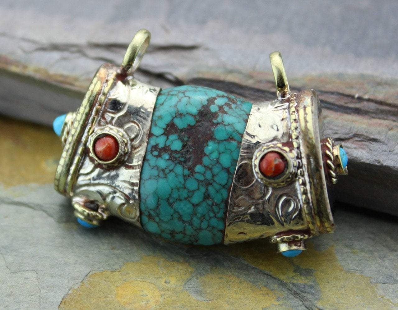 A perfect single pendant or focal bead for a mala or necklace. Turquoise with hand made filagree end wraps and coral and turquoise beads. Turquoise color and size will vary with each bead.