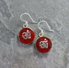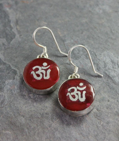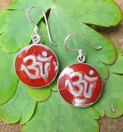Hand inlaid coral with a silver OM on each earring. Made in Nepal.