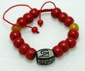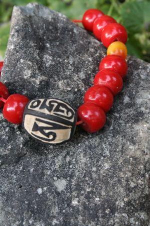 Coral adornments are seem all over the Himalayas. Tibet, however has no oceans! This Tibetan coral is the traditional 'white heart' stone dyed red. Mala includes a hand carved Om Mani stone spacer. Fully adjusts using the sliding knot. Coral stones are 12mm. Made in Nepal.