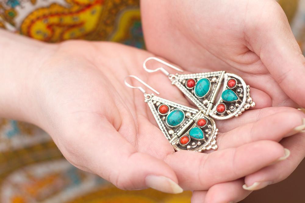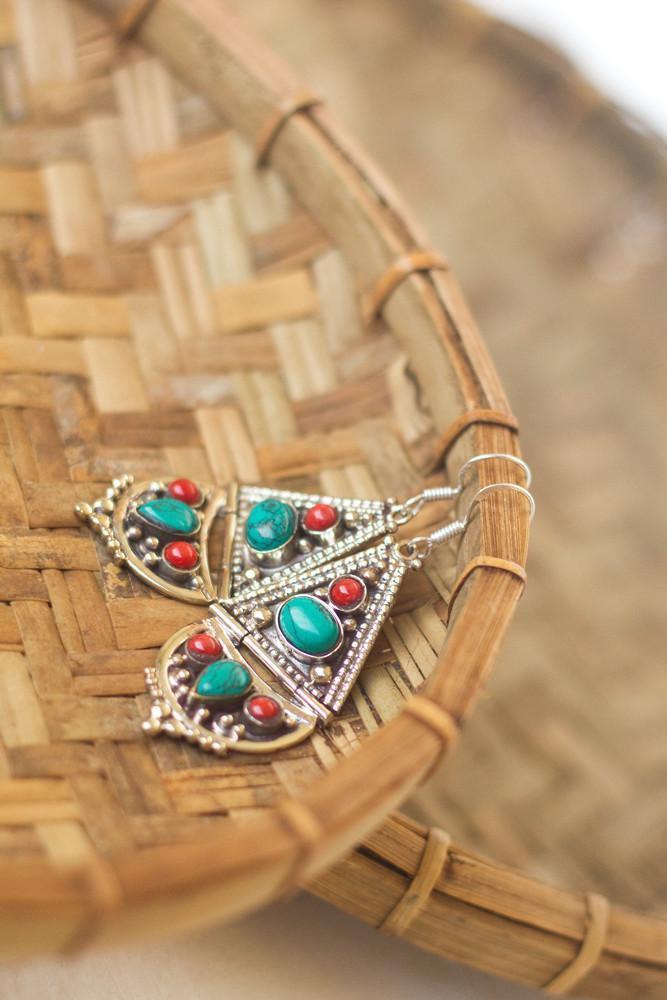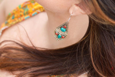 These decorative silver-plated dangle earrings are accented with cheery coral and turquoise stones.