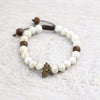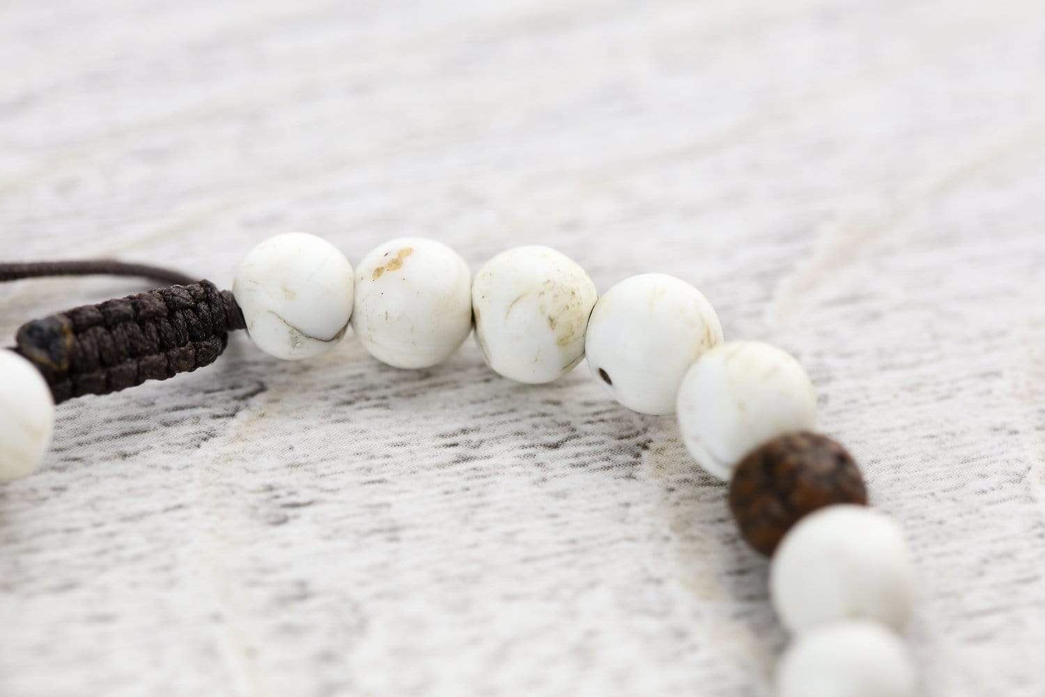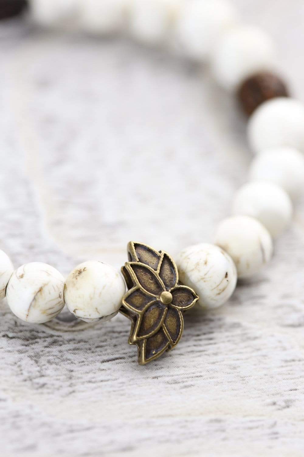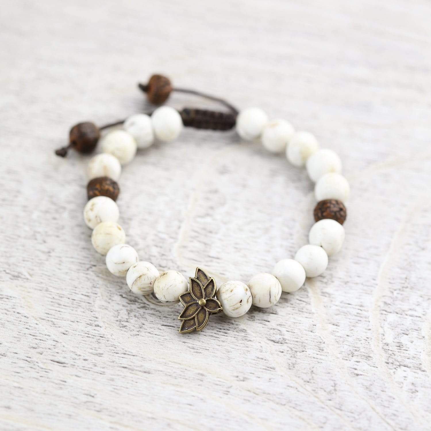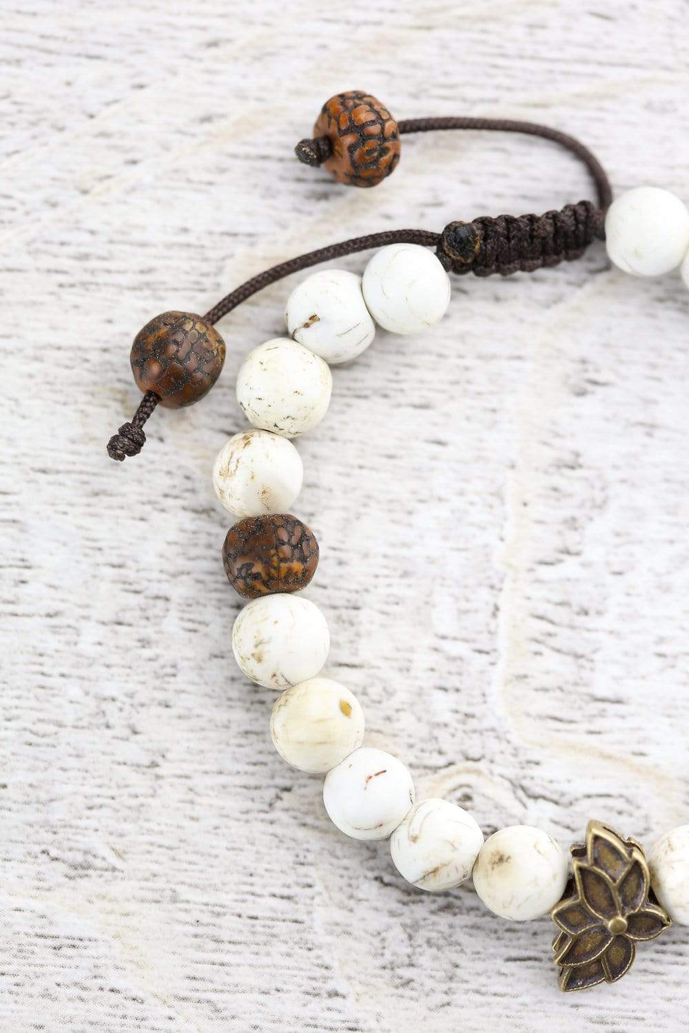 Adjustable wrist mala measures approximately 6.5 inches around when fully tightened and opens to about 8.5 inches. Beads are 8-9mm. Lotus charm is about 0.6 inch.