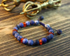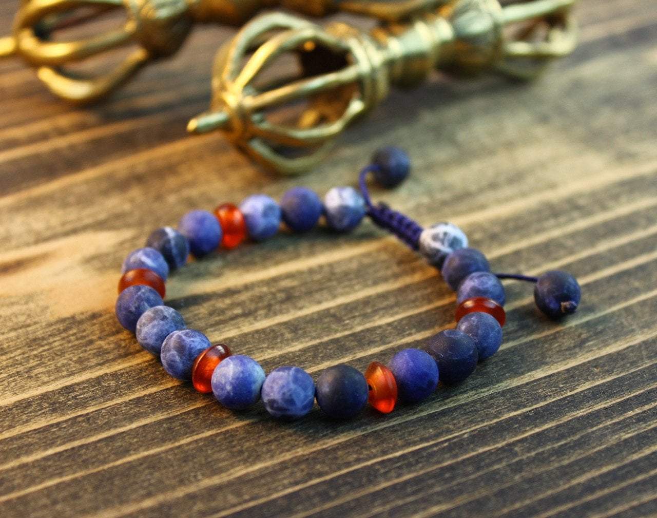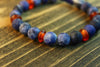 Adjustable wrist mala made strung on blue cord measures approximately 6 inches when closed and 8 inches when fully open. Includes 8mm matte lapis and water buffalo horn beads.