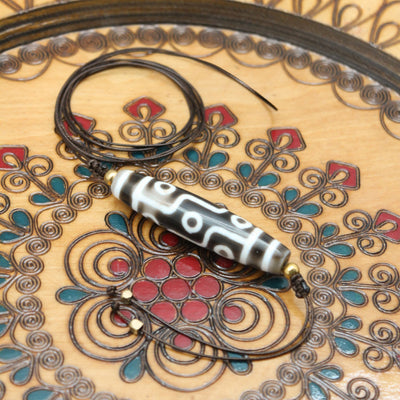 Each of our Dzi bead necklaces are hand strung right here at the DharmaShop with beads collected in the last 17 years from Kathmandu, Nepal. This necklace features a nine-eyed true agate modern Dzi strung vertically on brown vegan leather cord with brass accents. Adjustable sliding knots at either end of the Dzi allow for an easily customizable necklace length.