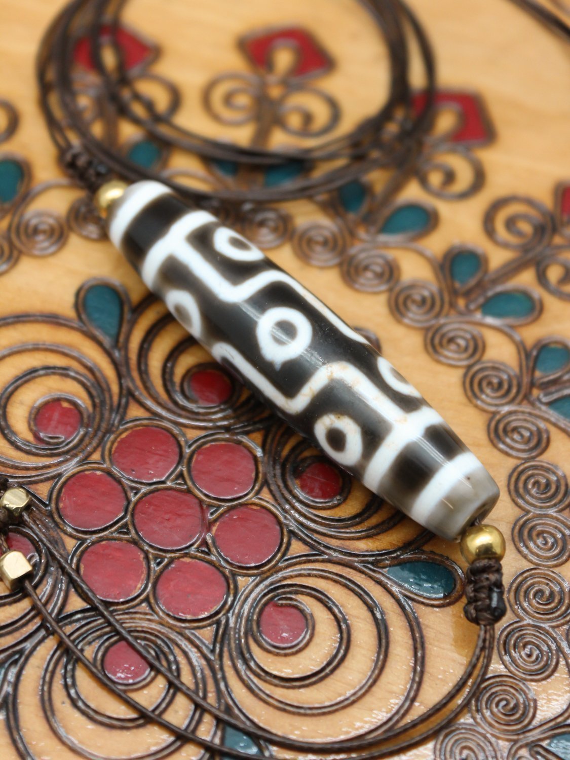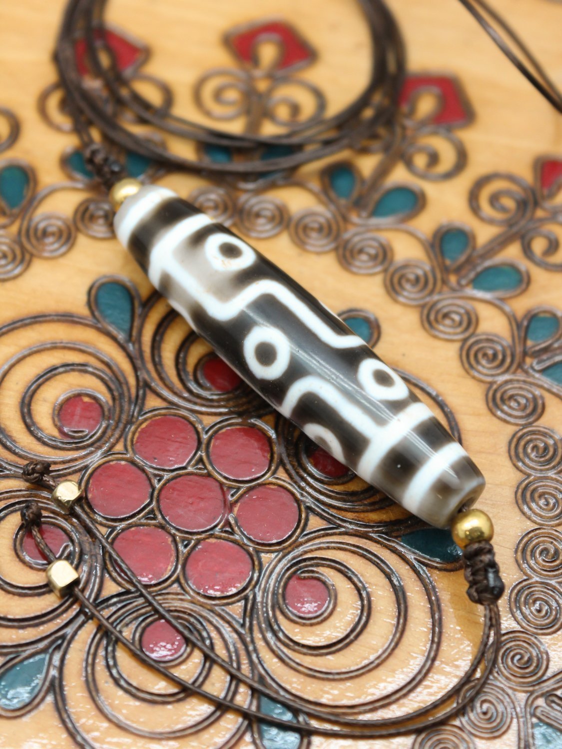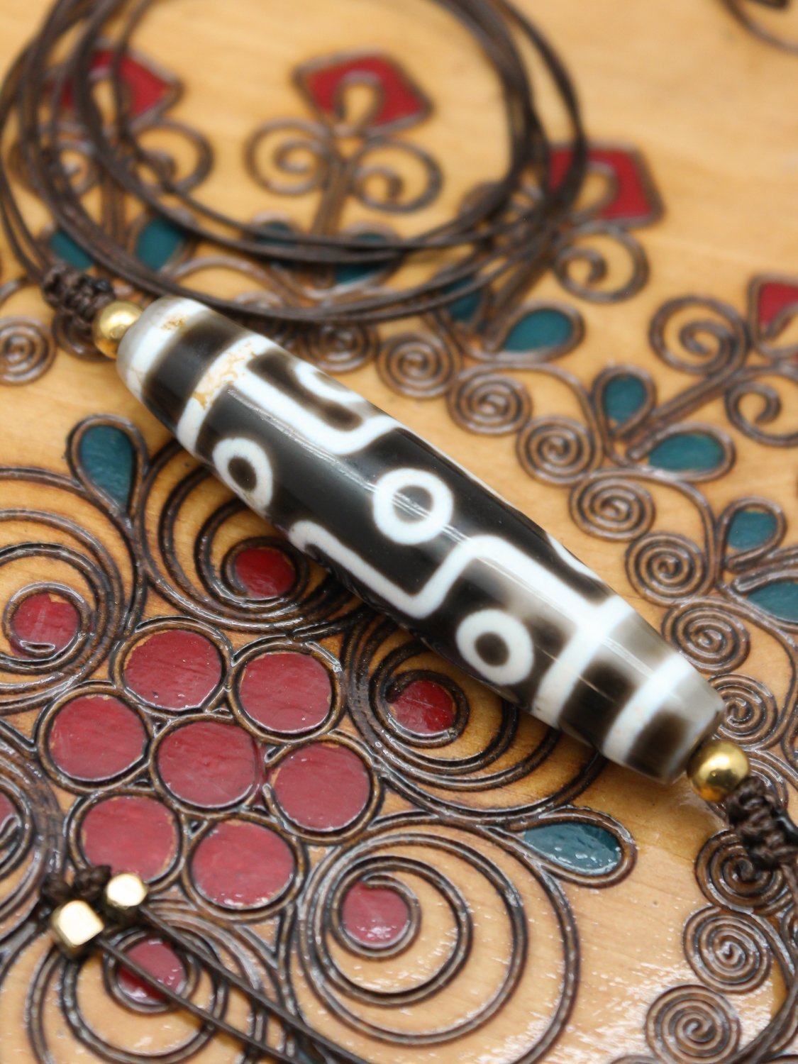 The nine-eyed Dzi bead assists its owner in gathering wealth, achieving good health and success, as well as gaining power, compassion, and glory. It acts as a protector, expelling evil. Nine-eyed Dzi is one of the most sought after, believed to represent the 9 planetary systems and its essence. This Dzi is touted as a window to wisdom.
