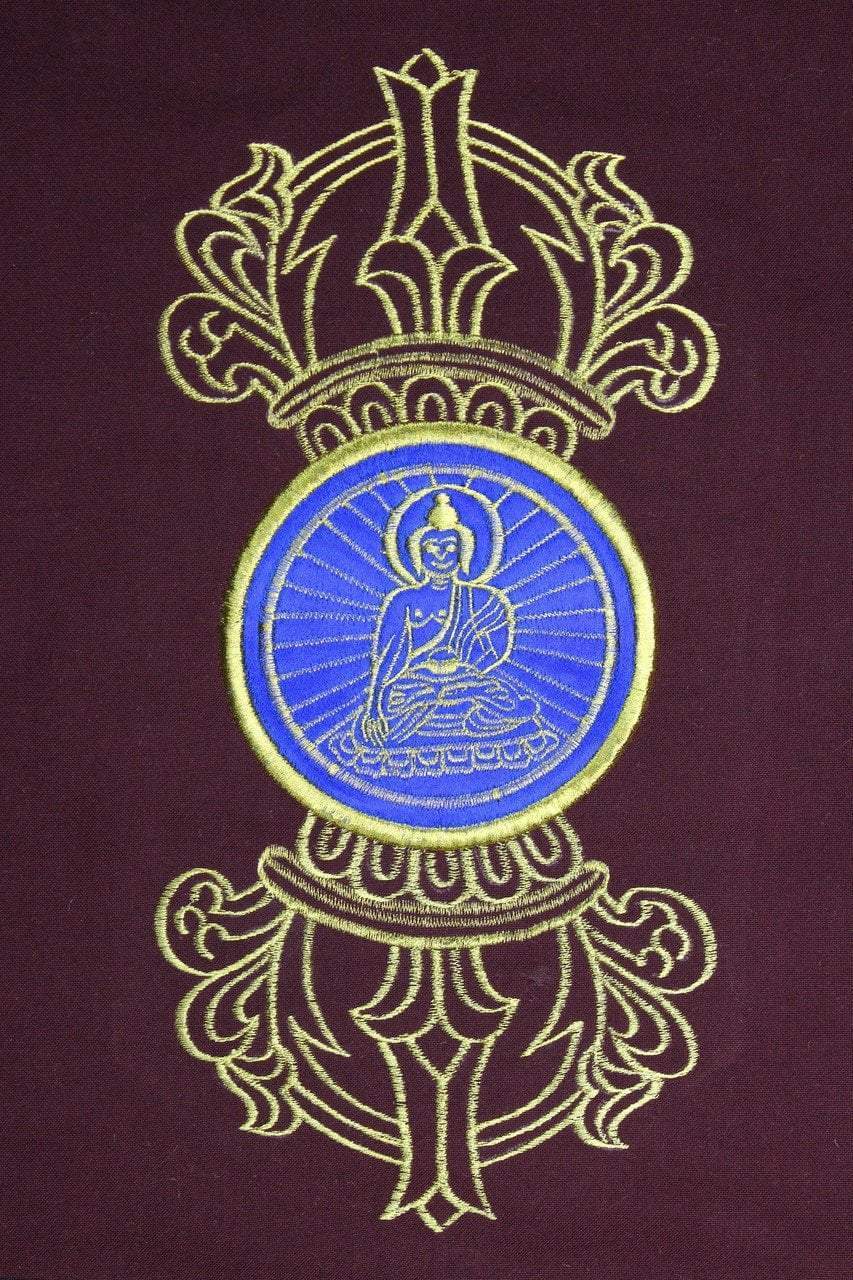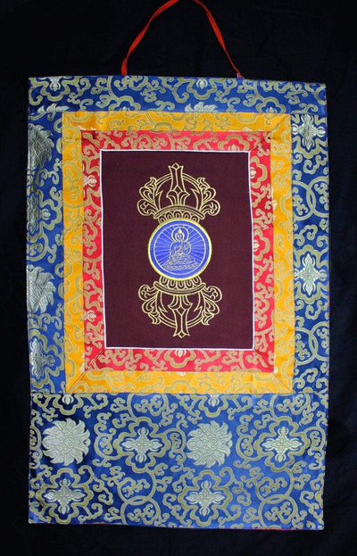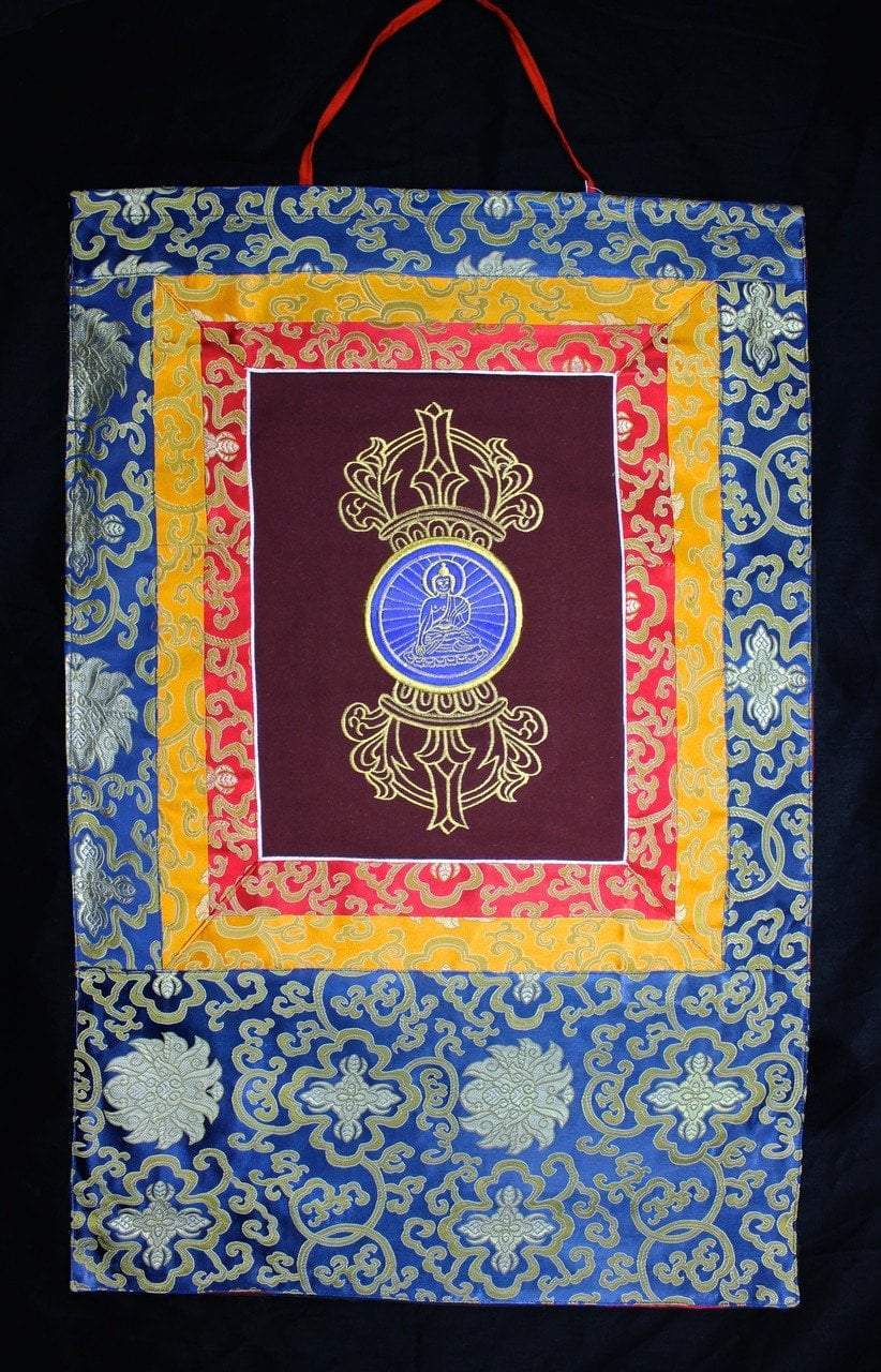 Awesome Buddha Double Dorjee wall hanging featuring red, yellow, and blue brocade.