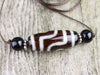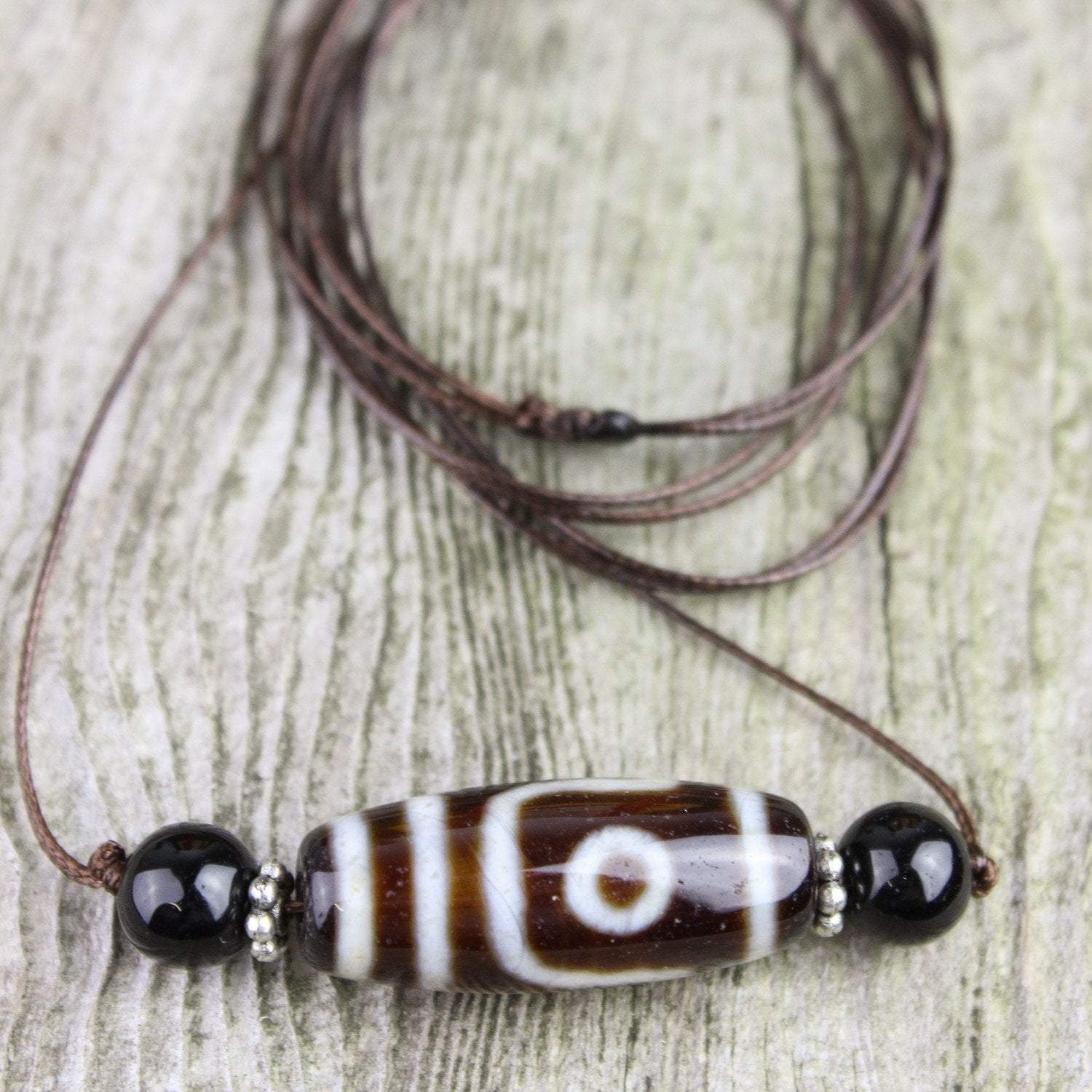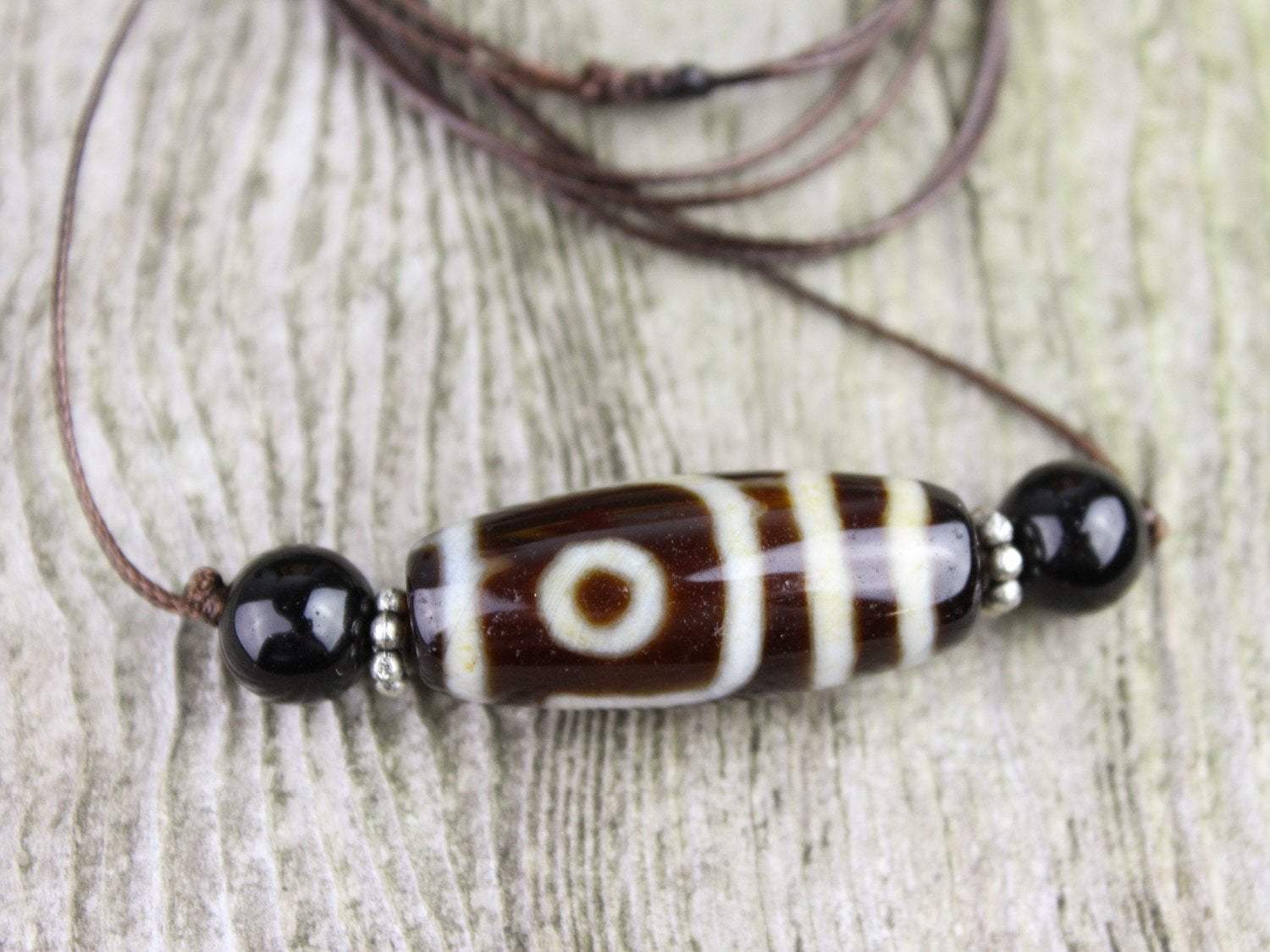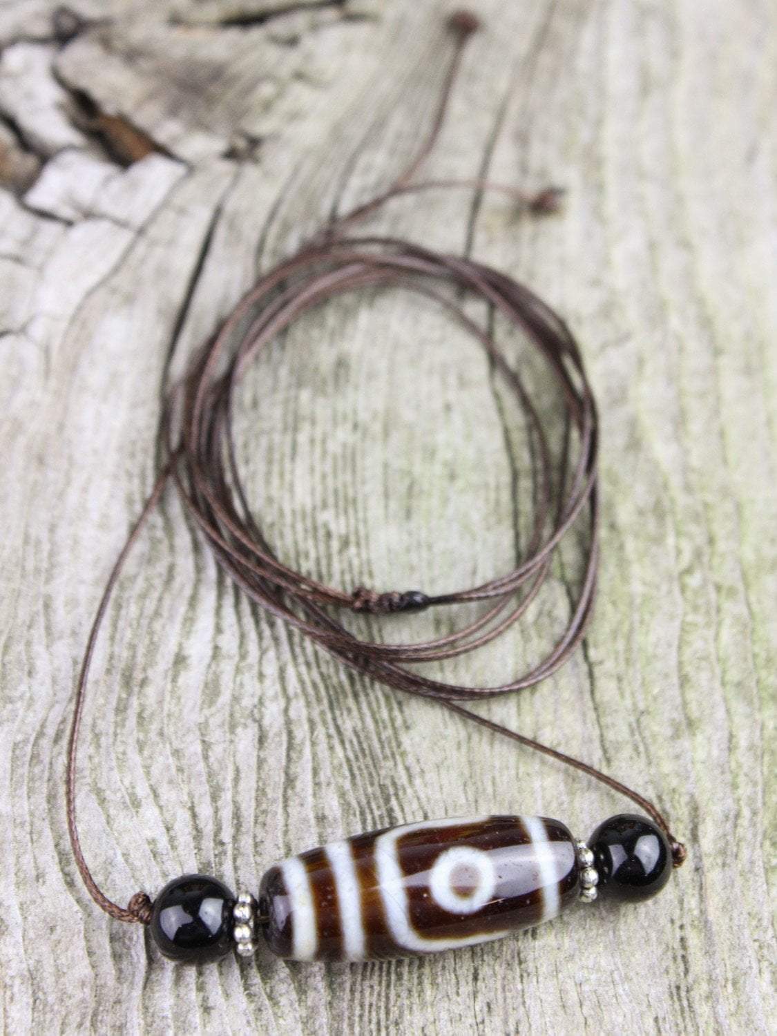 Each necklace is hand strung right here at the DharmaShop with Dzi beads collected in the last 17 yearsfrom Kathmandu, Nepal. As each bead is handmade, size or details may vary marginally - please let us choose. Limited quantity; only two available. Necklace features a double eyed Dzi with onyx accent beads on brown vegan leather cord.