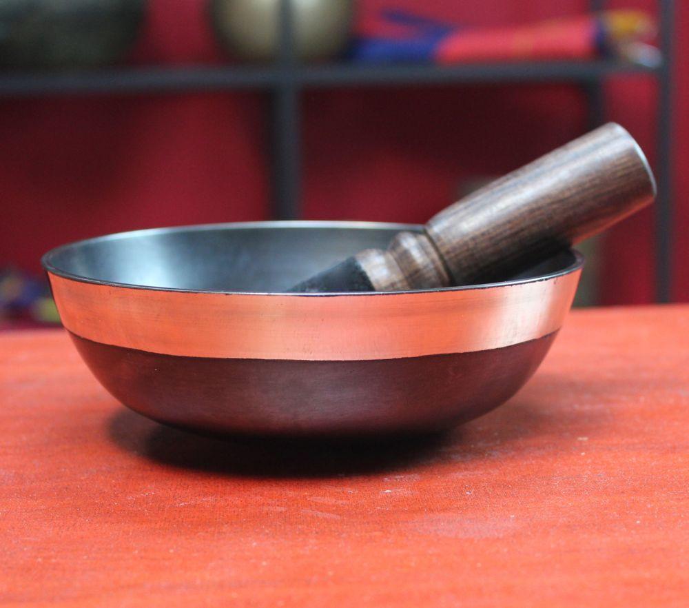 Rings at a G note, 438 Hz, when hit with a woolen mallet. Measures approximately 6 inches in diameter.