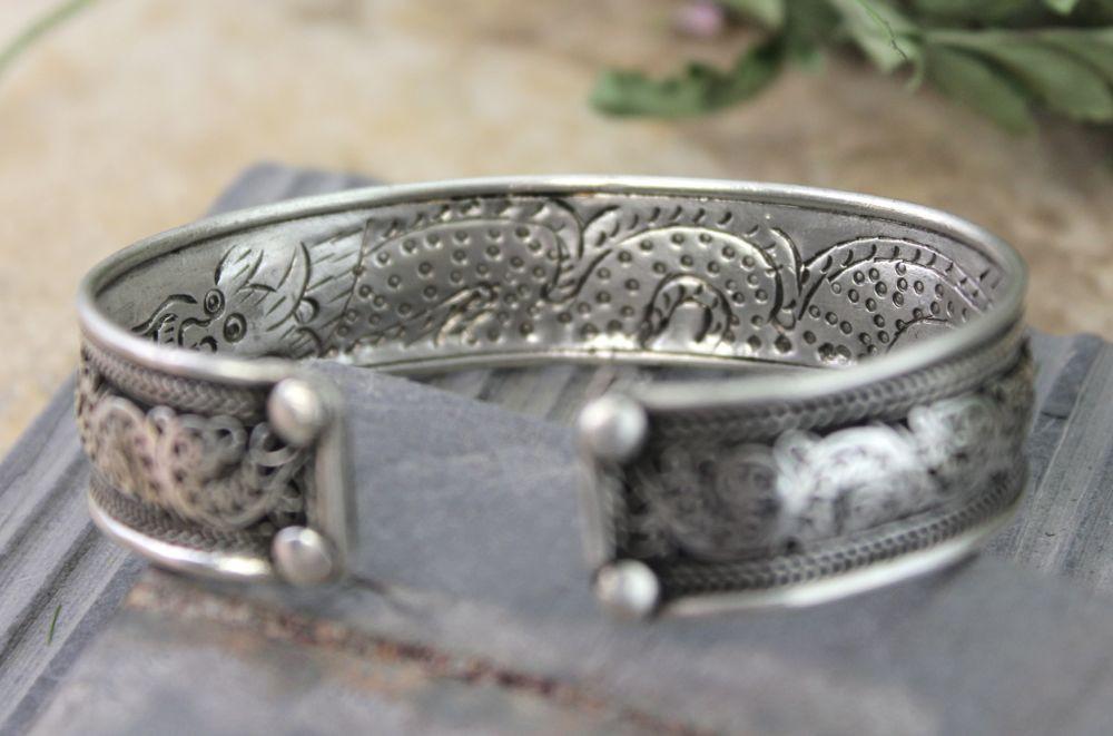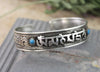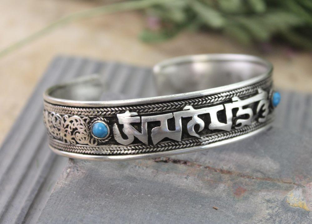 The prayer for compassion Om Mani Padme Hum is inscribed in silver plated brass with two turquoise stones on either side. A dragon design is hand carved into the inside of the bracelet.