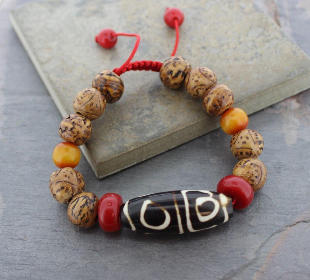This fully adjustable wrist mala has ten bodhi seed beads with eyes, two coral, two amber and one medium Dzi bone bead.  Strung on an adjustable red cord with coral toggle beads. Simply slide the intricate knot along the cord for easy adjustment to any size.