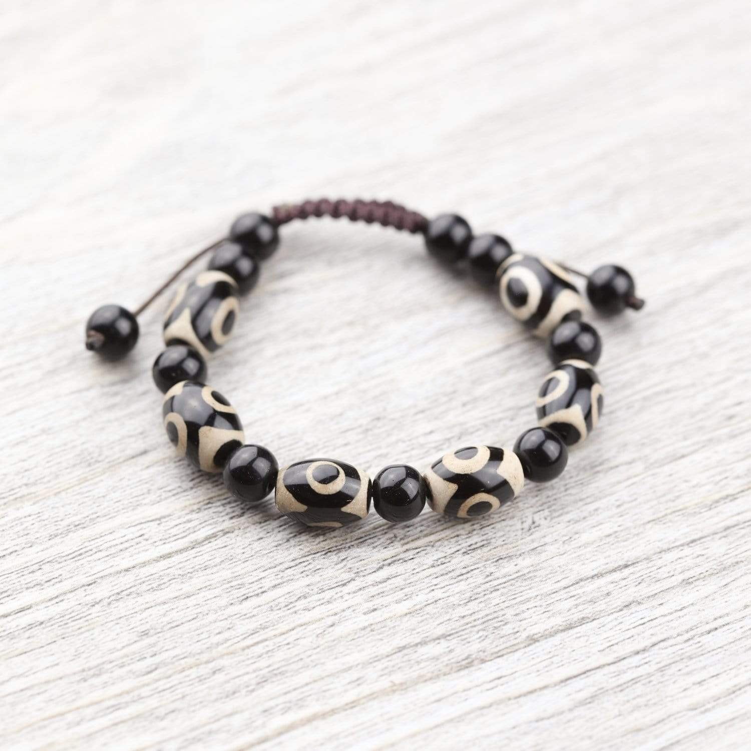 Adjustable wrist mala measures approximately 6 inches around when fully tightened and opens to about 9 inches. Beads are 8mm, Dzi beads are about 14mm by 10mm.