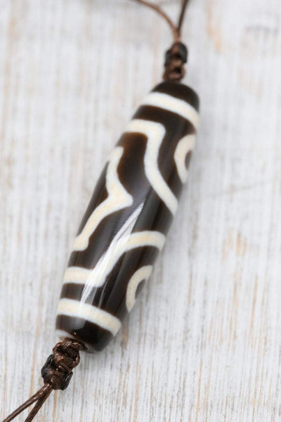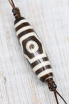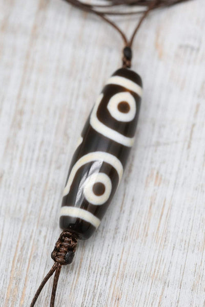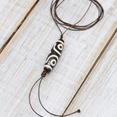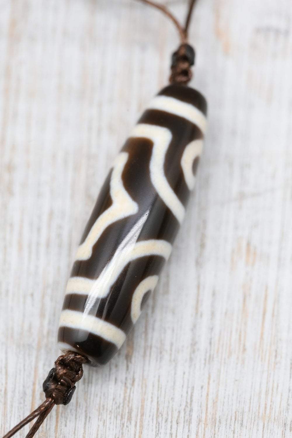 • This one-of-a-kind necklace features a vertical hanging true agate modern three-eyed Dzi bead strung on brown vegan leather cord.  A sliding knot on either end of the Dzi allows for versatile adjustability.