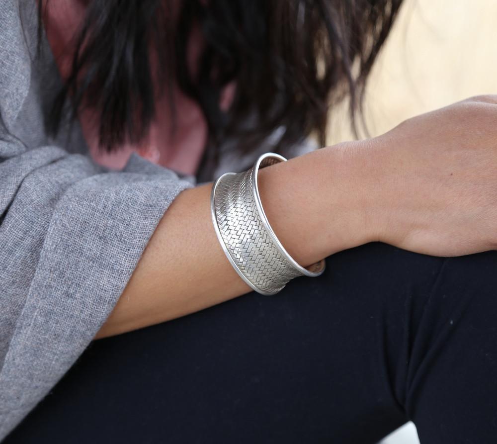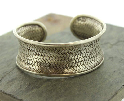 Uniqueterling silver cuff bracelet made with an amazing technique of actually weaving the silver strands together in the manner of a fine basket weaver (when held to the light, bright beams will shine through!). The result is a superb suppleness and soft touch. An elegant piece when worn for a special occasion or simply out and about to brighten a day with jeans and tunic.