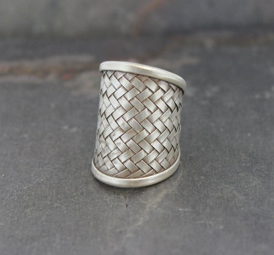 These amazing Hill Tribe Silver (.98 pure silver) cuff rings are made with a unique technique of actually weaving the silver strands together in the manner of a fine basket weaver (when held to the light, bright beams will shine through!). The result is a superb suppleness and soft touch.