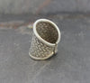 Band is just over 1 1/4 inch wide on top of finger. Handmade by silversmiths in Thailand.