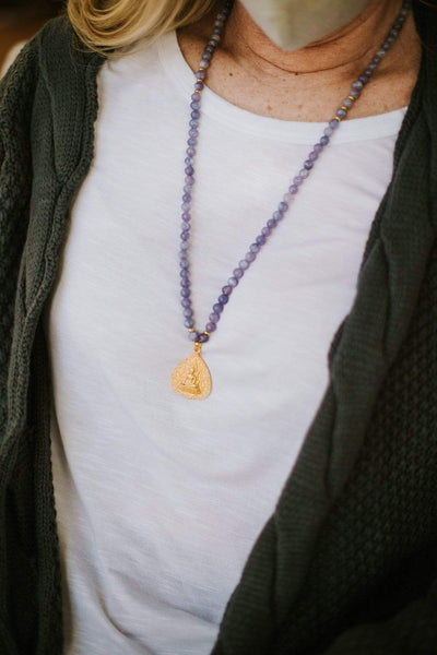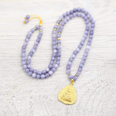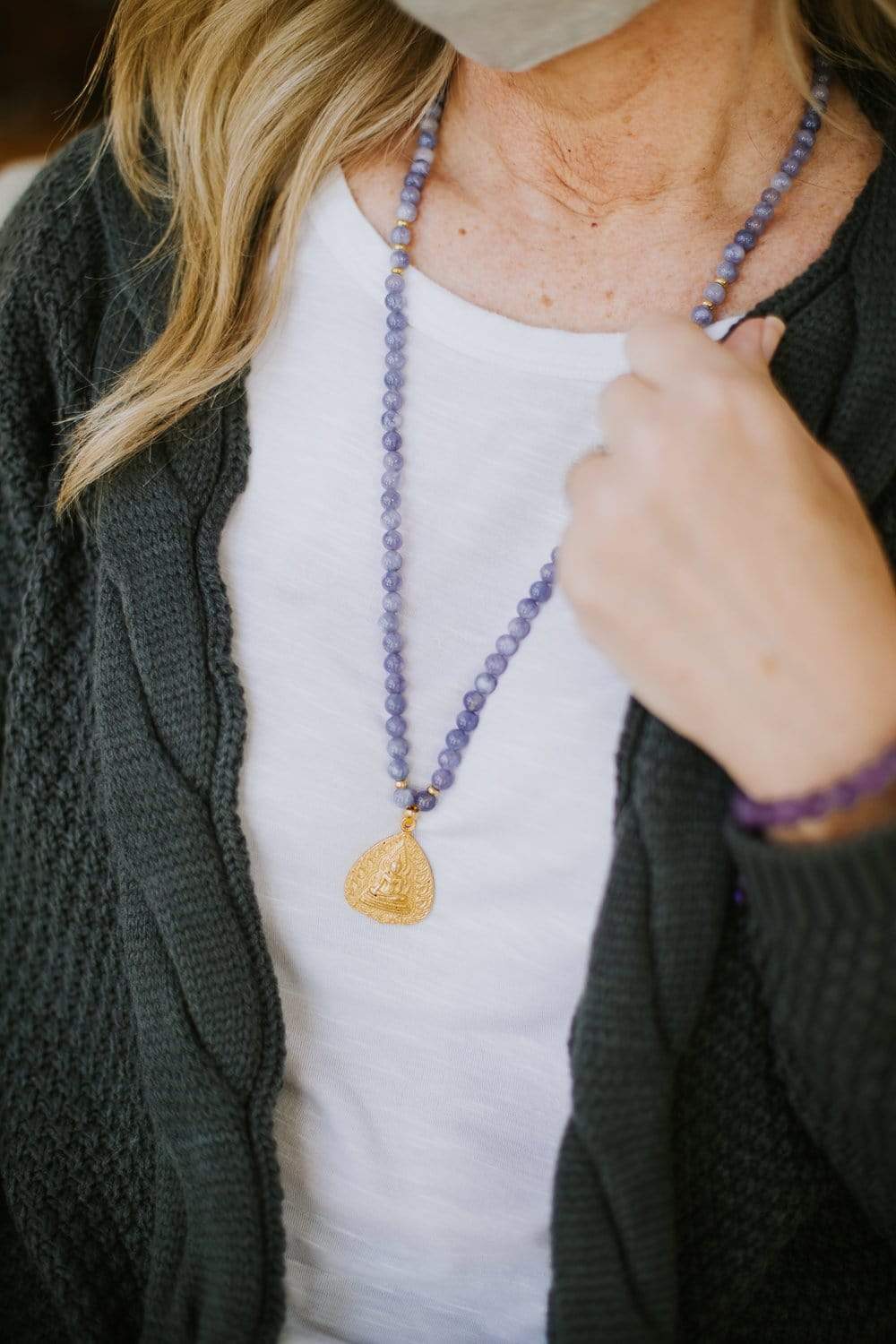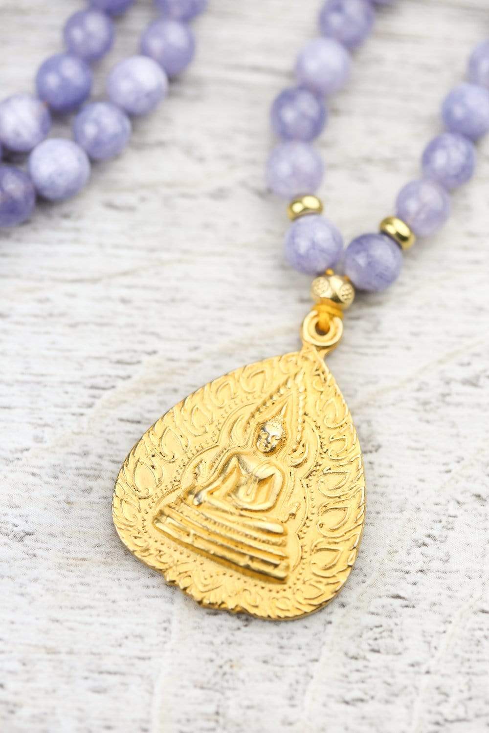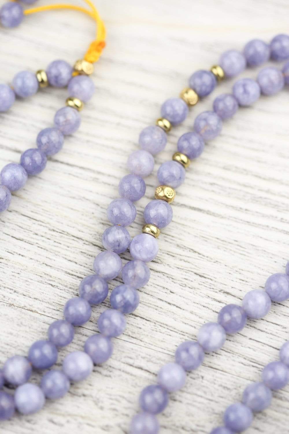 • An exclusive and limited edition DharmaShop 108 mala!  Made with gorgeous periwinkle tanzanite beads and finished with a handcrafted gold amulet from Thailand.