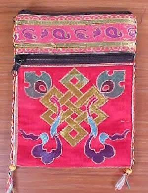 This red bag has two zippered and one non-zippered pocket and a multi colored strap so it can be worn over the shoulder. Handmade in Nepal.