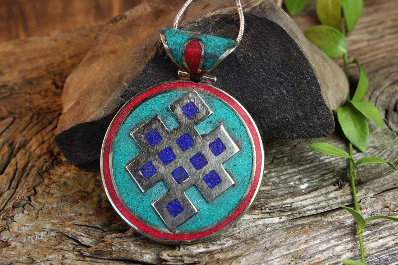 Large white metal pendant with inlaid turquoise, coral and lapis with a traditional eternal knot design. Comes on brown suede cord.