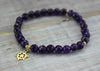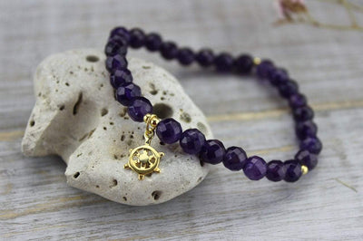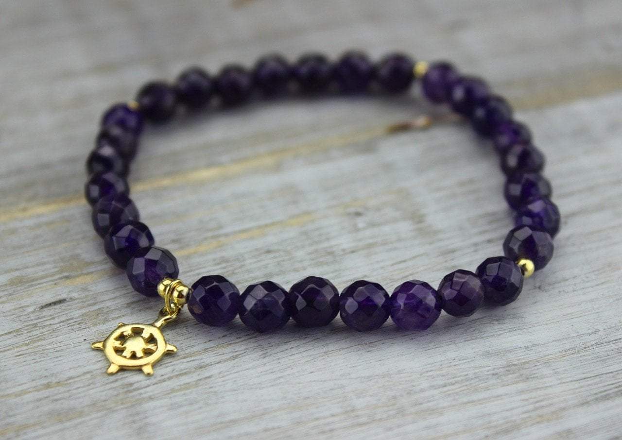Vermeil Dharma Wheel charm strung with faceted amethyst beads from India.