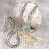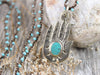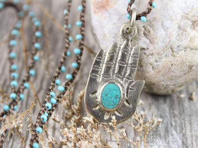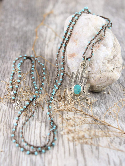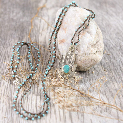 This charming necklace features a hand stamped brass Buddha hand pendant with a turquoise stone accent on a hand woven turquoise chain finished with silver lobster clasp.