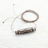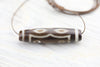 Measures just under 2 inches long and 0.5 inch wide. Strung on adjustable brown vegan leather cord.