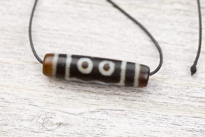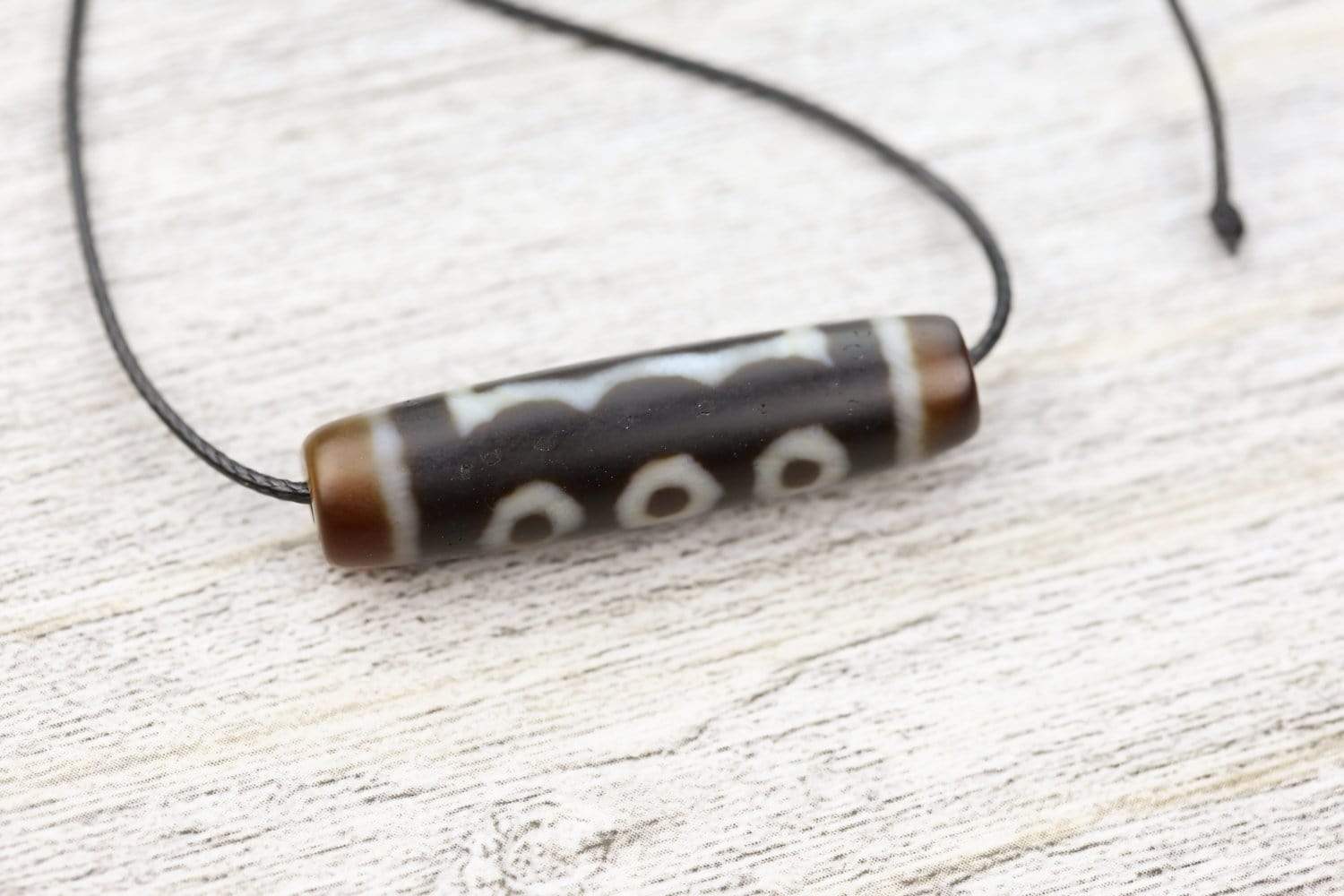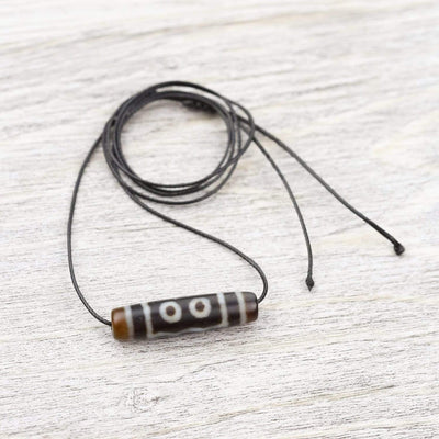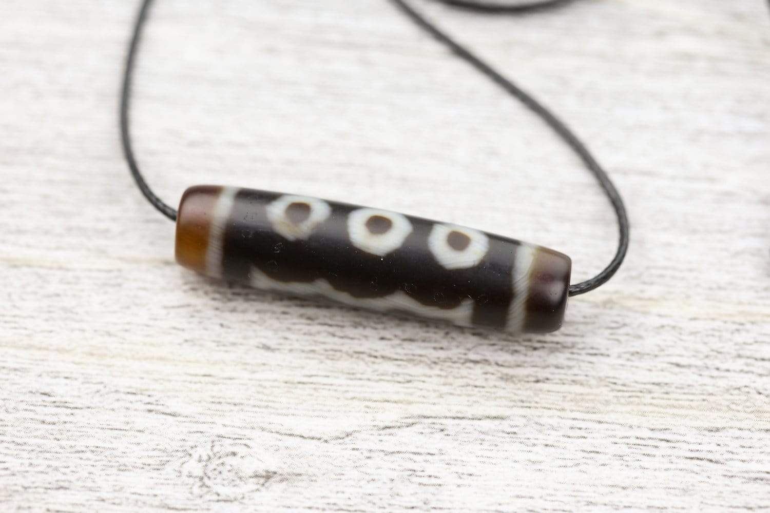 • We had our jewelry specialist hand string this true agate 5-Eye Dzi bead on black vegan leather cord.  It features a sliding knot for adjustable length.