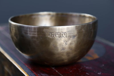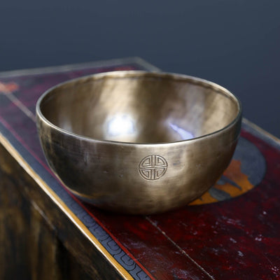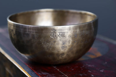 Each bowl features gorgeous hand carved details including an exclusive full moon singing bowl stamp, an original makers mark, and the mantra of compassion in Tibetan script.