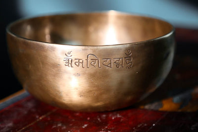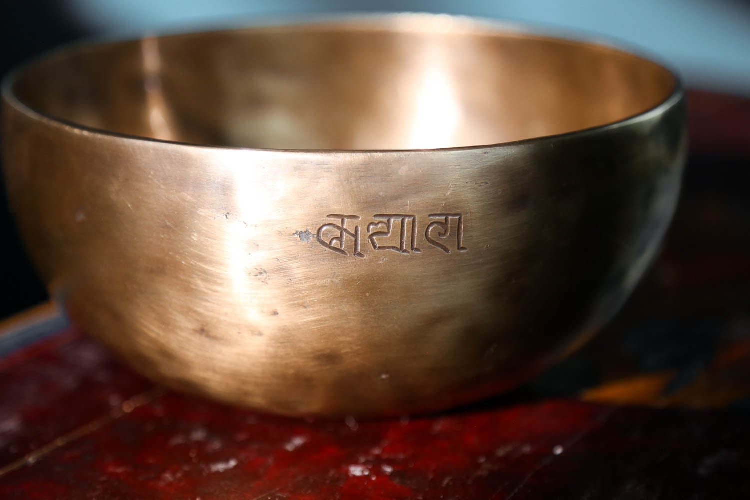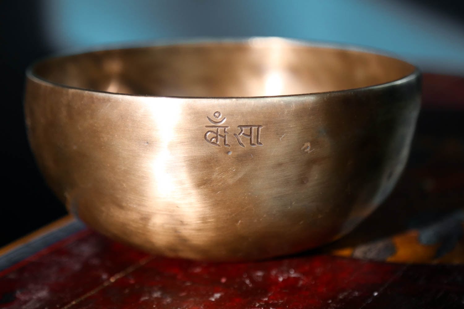 Each bowl features gorgeous hand carved details including an exclusive full moon singing bowl stamp, an original makers mark,  and the mantra of compassion in Tibetan script.  The mantra invokes the powerful benevolent attention and blessings of Chenrezig, the embodiment of compassion.  The full moon singing bowl stamp is also known as the symbol of longevity and happiness.