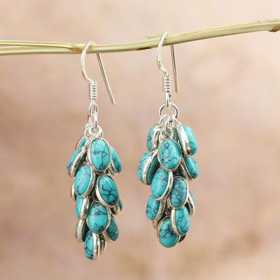 These earrings feature clusters of turquoise stones dangling from elegant sterling silver french hooks. They pair well with both formal and causal outfits, and will be the perfect accessory for you or someone special this summer!