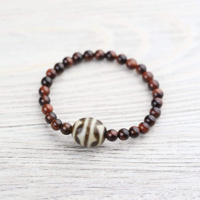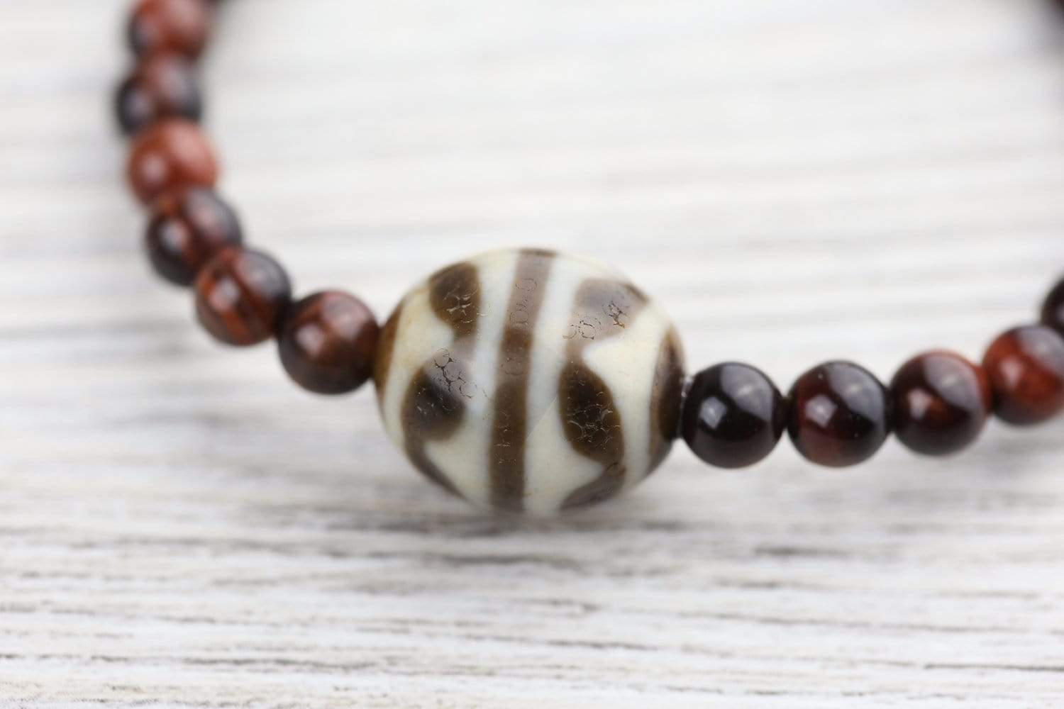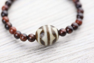 Bracelet measures approximately 6.75 inches around on stretchy cord. Beads are 6mm. Dzi measures about 0.75 inch long and 0.6 inch wide. Quantities are limited, so grab one while you can!