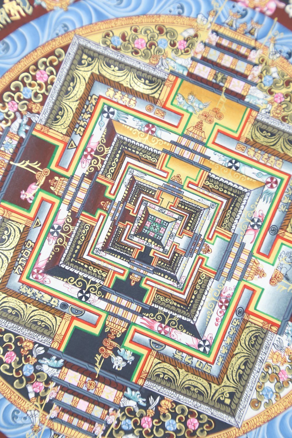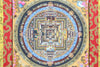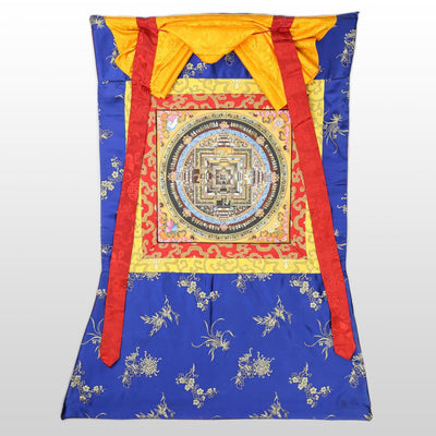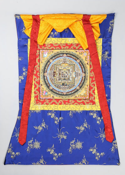Thangka depicts a beautifully detailed Kalachakra mandala design and comes framed in a multi-colored traditional Tibetan brocade.  The painting is done by hand on cotton canvas using natural mineral and vegetable pigments with 24K gold details.  The complicated designs, intricate brushstrokes, and extraordinary detail make these thangkas genuine works of art.