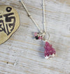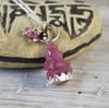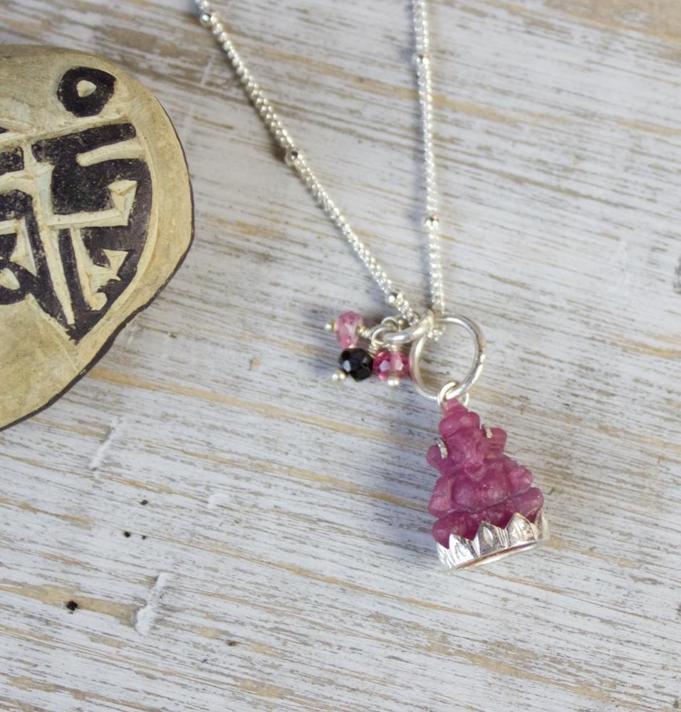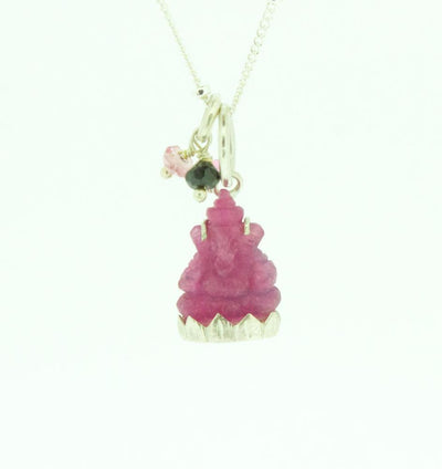 This very unique handcarved ruby Ganesh pendant is strung on a sterling silver satellite chain. Three 1mm faceted dangling gemstones add richness and color.