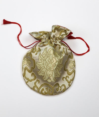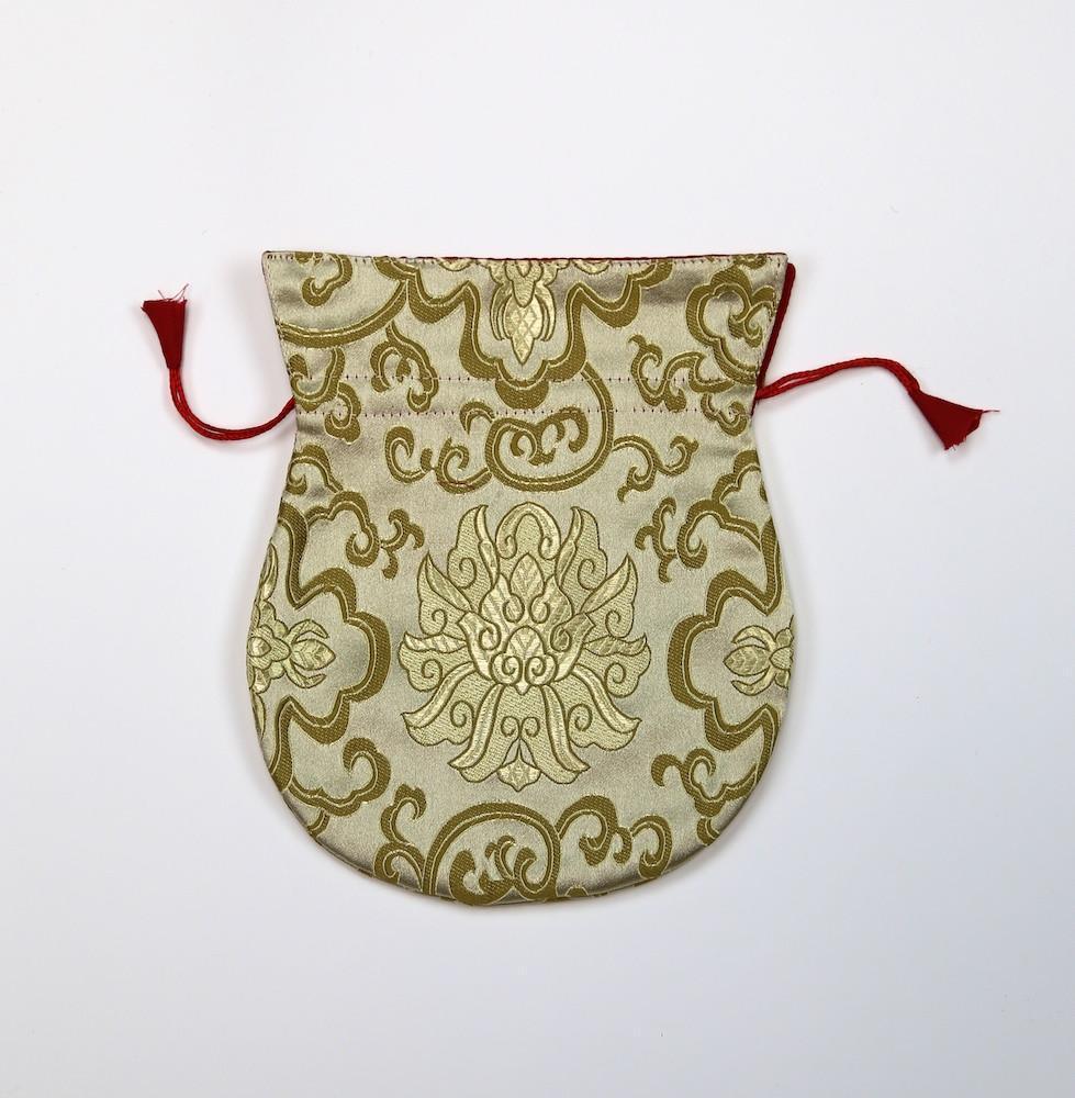 Perfect for traveling with your mala or for use as a unique, elegant clutch. Constructed of medium-weight, embroidered silk with a durable red cotton liner. Includes red drawstring closure.