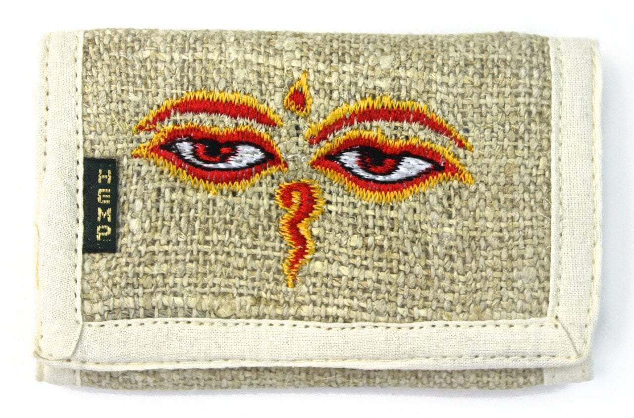 The perfect way to store all of your money and valuables. Cotton and hemp blended wallet with an orange and yellow pair of Buddha eyes hand sewn on the front. Multiple pockets inside this tri fold wallet; including a zipper pocket and clear slot for your drivers license. Hand made in Nepal.