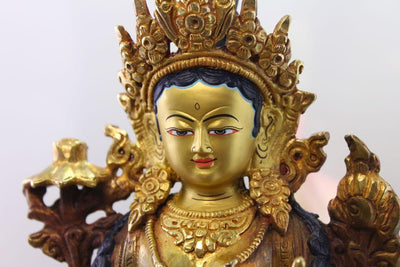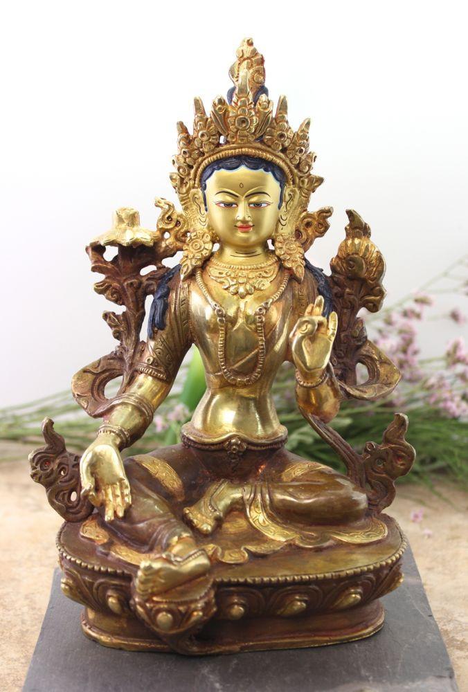 This exquisite Green Tara statue is handmade in Kathmandu Nepal by the Shakya family. This family has been making bronze statues for many generations and is well known all over the world.