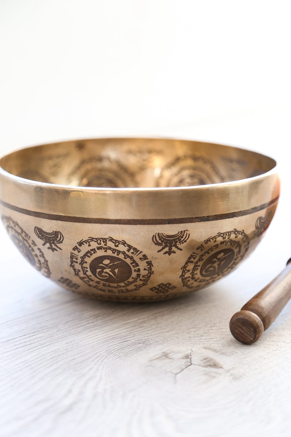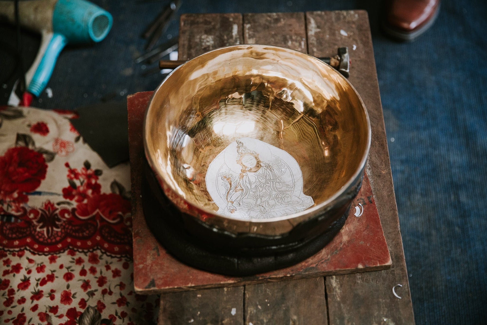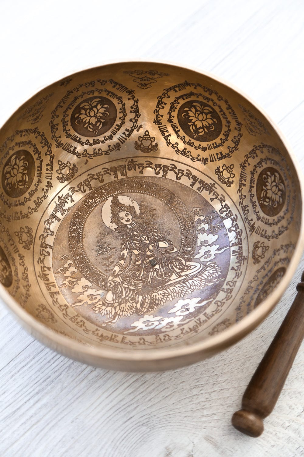 • The DharmaShop team here in Michigan worked for almost a year with the singing bowl artisans in Kathmandu to create this exclusive etched Green Tara bowl, handcrafted by 4th—and 5th-generation singing bowl masters.