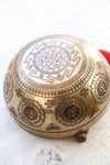 • The inside features an intricate green tara design with lotus flowers surrounded by mantras. Double dorje symbols decorate the outside of the bowl, and a sacred geometric design, the Eternal Knot, grounds the base.