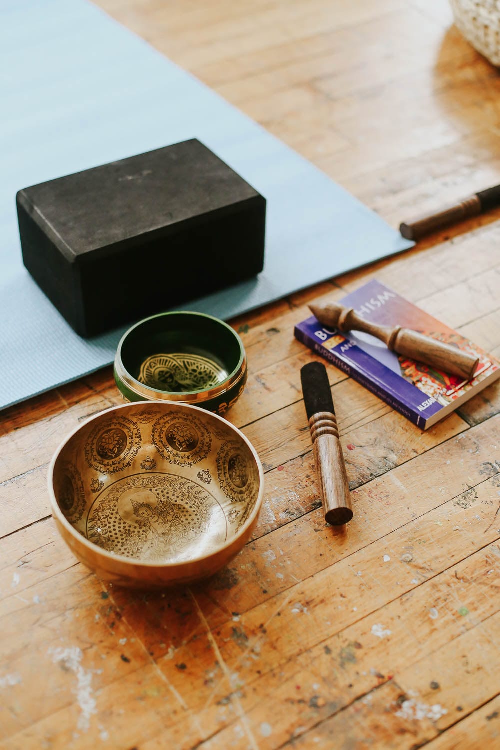 Your bowl comes with a wood and suede striker and our green brocade cushion hand stitched and stuffed with up-cycled materials.Includes a DharmaShop keepsake bag.