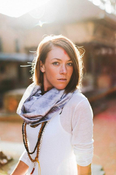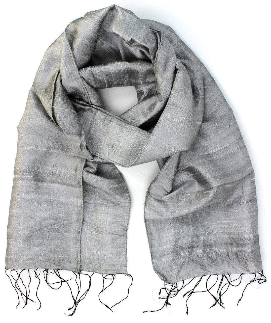 The perfect, lightweight polyester scarf for warmer months or a light chill in the air.  This light grey, shimmery colored scarf with black fringe was hand sewn in Kathmandu, Nepal.  100% polyester.