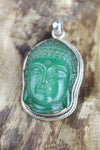 Elegant cast Buddha head with serene meditative expression is set in sterling silver with sterling bail. Intricate hand rope-work decorates the sides of setting. Handmade in Nepal.