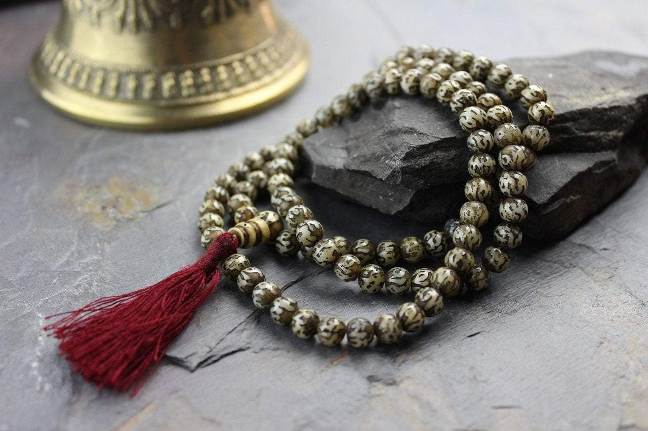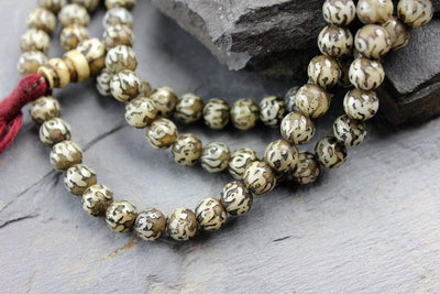 This limited edition 108 bead mala is very special. 108 hand carved OM beads carved of 6mm naga shell beads.