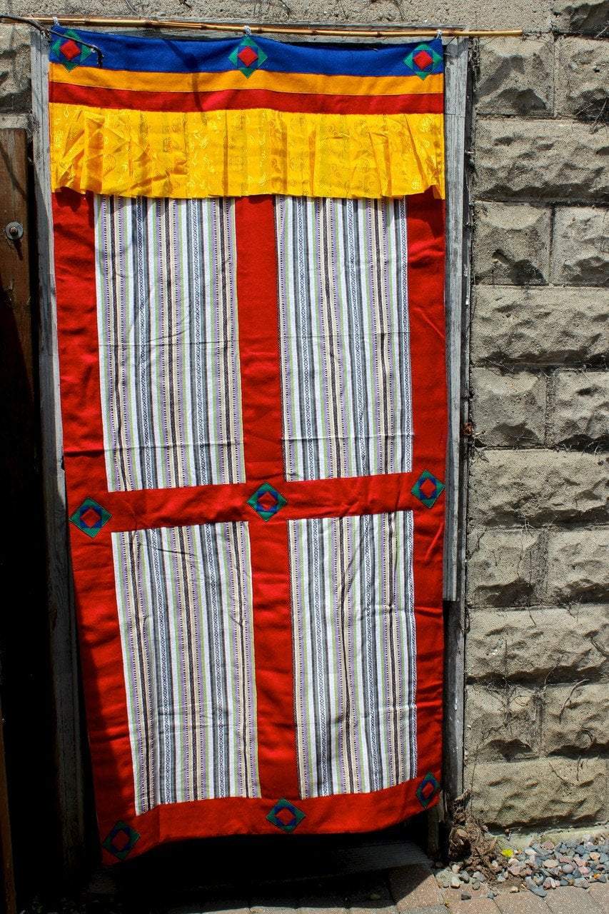 Embroidered Tibetan pattern door curtain with top ruffle. These curtains are used to keep the chill out in the high Himalayas. The curtains may be used outside your front door or inside on interior doors. Many of my customers use them to make a sacred space in their home.