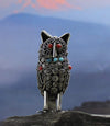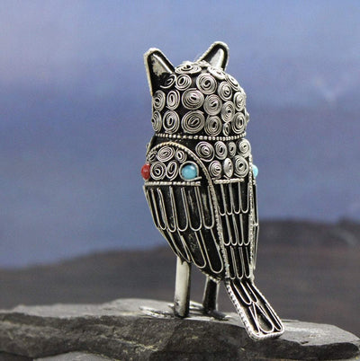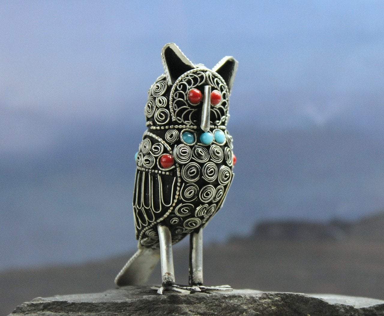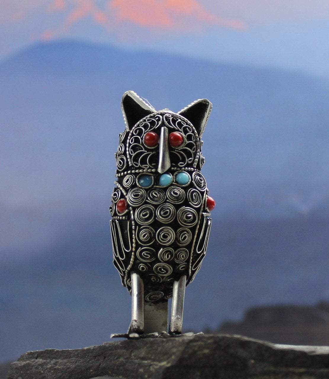 Handcrafted metal figurine with impressive details and small inlaid stones.
