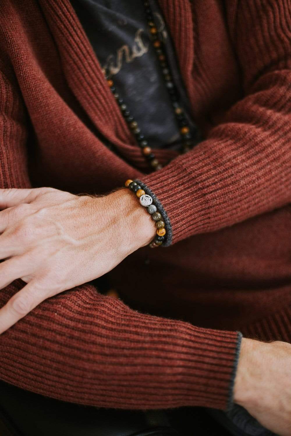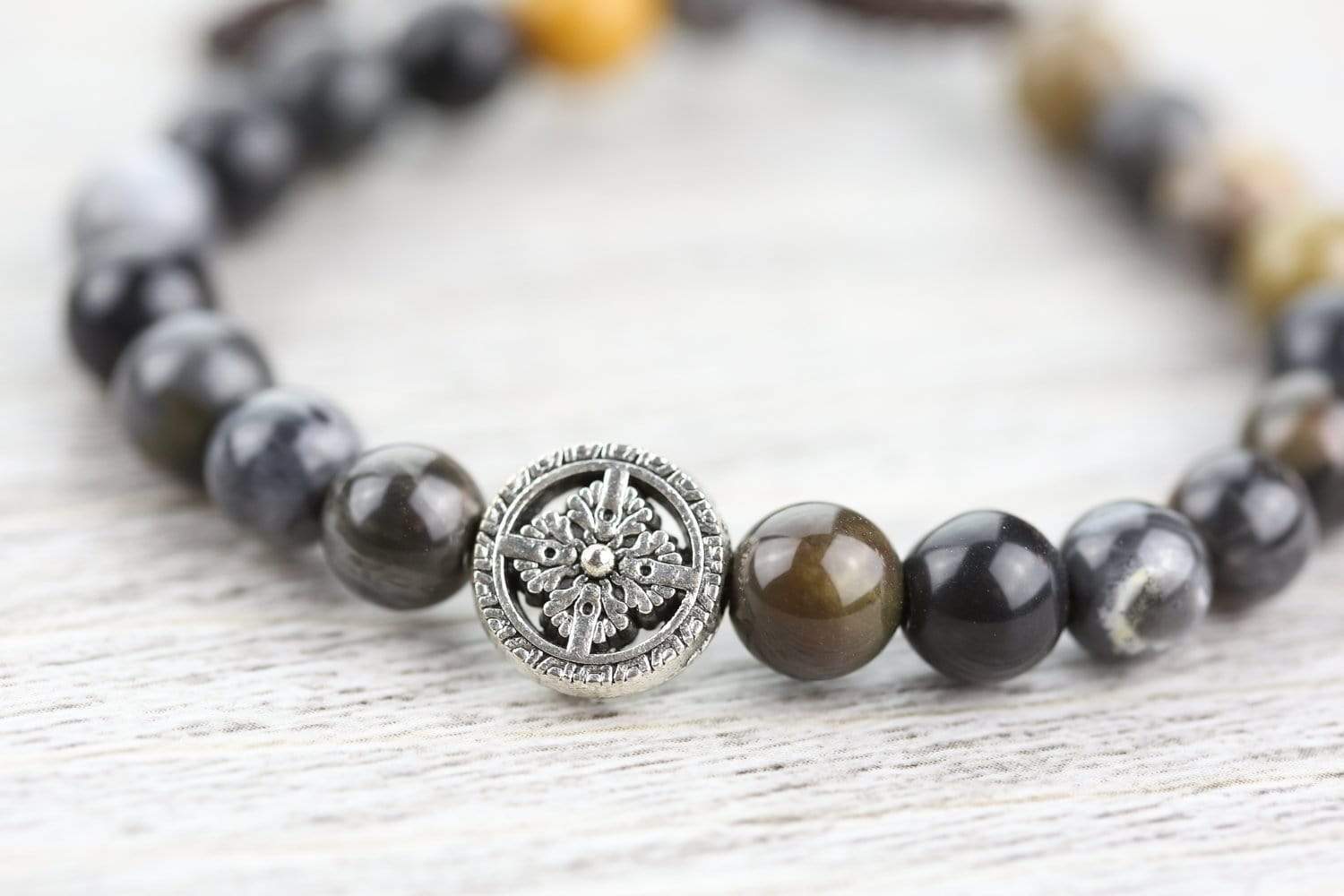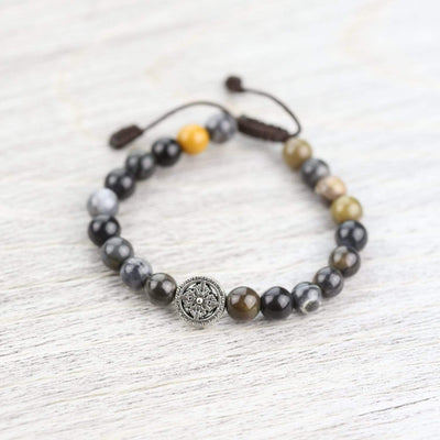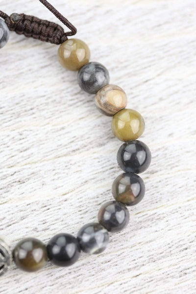 Adjustable wrist mala measures approximately 6.5 inches around when fully tightened and opens to about 9 inches. Beads are 8mm. Charm is about 0.5 inch.