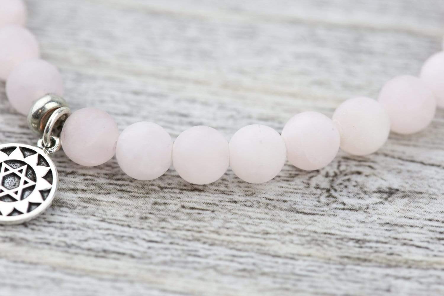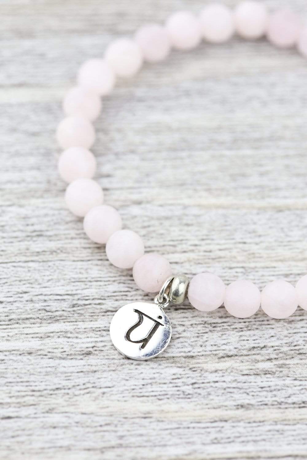 • Made with matte Rose Quartz gemstone beads and finished with a sterling silver charm that features the Heart Chakra symbol on one side with associated mantra symbol on the other.