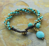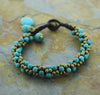 7 inches around, button closure handmade with no leather content, waxed cotton cord brass and turquoise