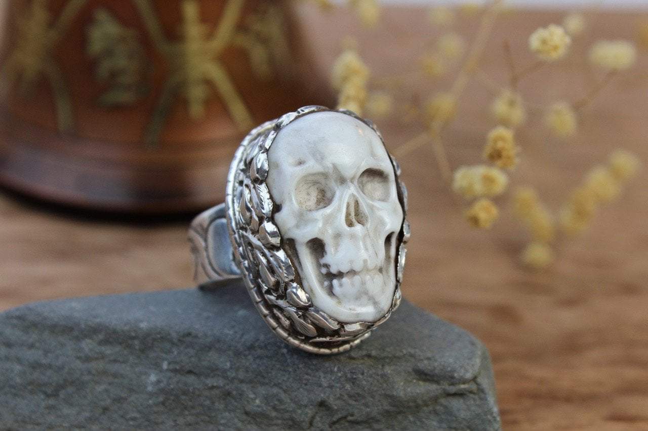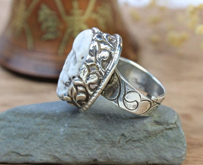 Howlite skull ring in an intricate sterling silver setting. Howlite is associated with the third chakra and believed to control rage by helping develop patience and a positive outlook on life. It is also believed to help with insomnia, slowing an overactive mind for a deep and restful sleep.